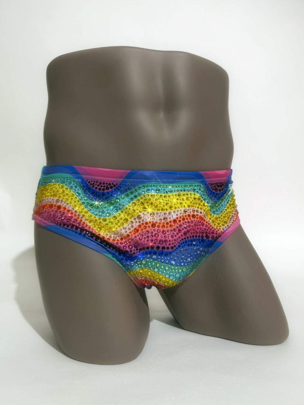 Made to Shine, Designed to Celebrate! Catch every ray—and every eye—with the Pride Rainbow Crystal Swimsuit, a radiant celebration of queerness, joy, and craftsmanship. This piece features a hand-embellished wave of rainbow rhinestones that flow seamlessly across the body, blending bold color with refined technique. Each crystal is carefully placed for ultimate brilliance while maintaining flexibility and comfort.